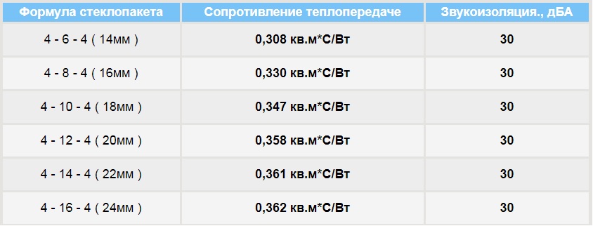 Основные характеристики стандартных однокамерных стеклопакетов с различными формулами представлены в размещенной ниже таблице.