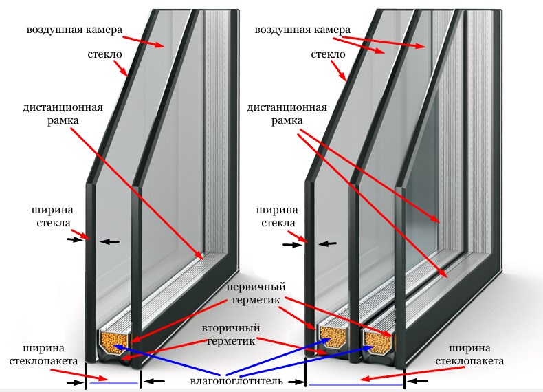 Стеклопакет представляет собой конструкцию из двух или трех стекол, пространство между которыми заполнено воздушными камерами. Ширина камеры варьируется в зависимости от используемой дистанционной рамки, обычно она составляет от 10 мм и более. Специальное адсорбирующее вещество внутри рамки поглощает влагу, благодаря чему стекла не запотевают изнутри, всегда остаются чистыми и не требуют сложного ухода. От толщины стеклопакета зависят его тепло- и звукоизоляционные свойства.